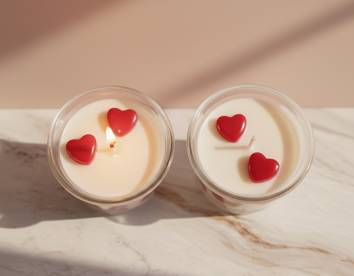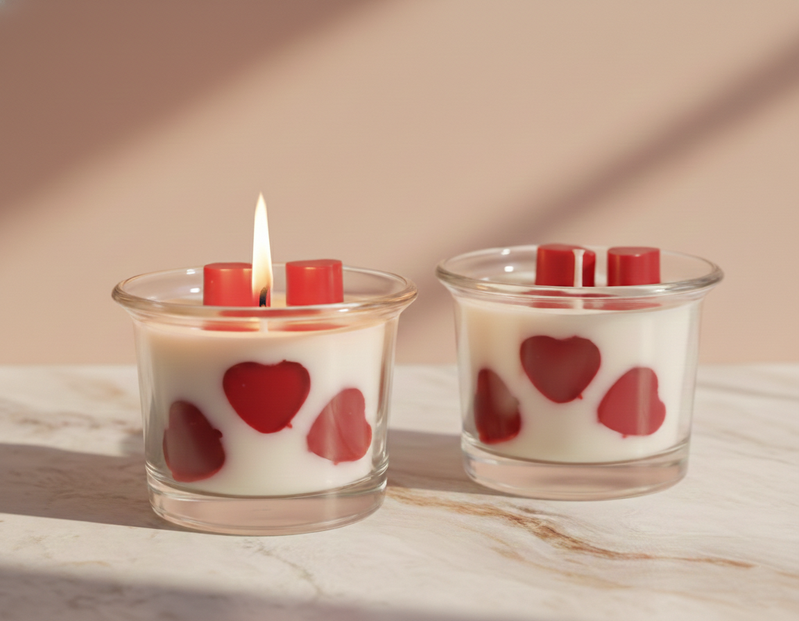 Set the mood for an unforgettable evening with Velvet Hearts, a candle that blends minimalist luxury with a romantic soul. These jars feature striking red heart embeds that appear to float within the creamy wax, creating a mesmerizing glow as the flame dances.